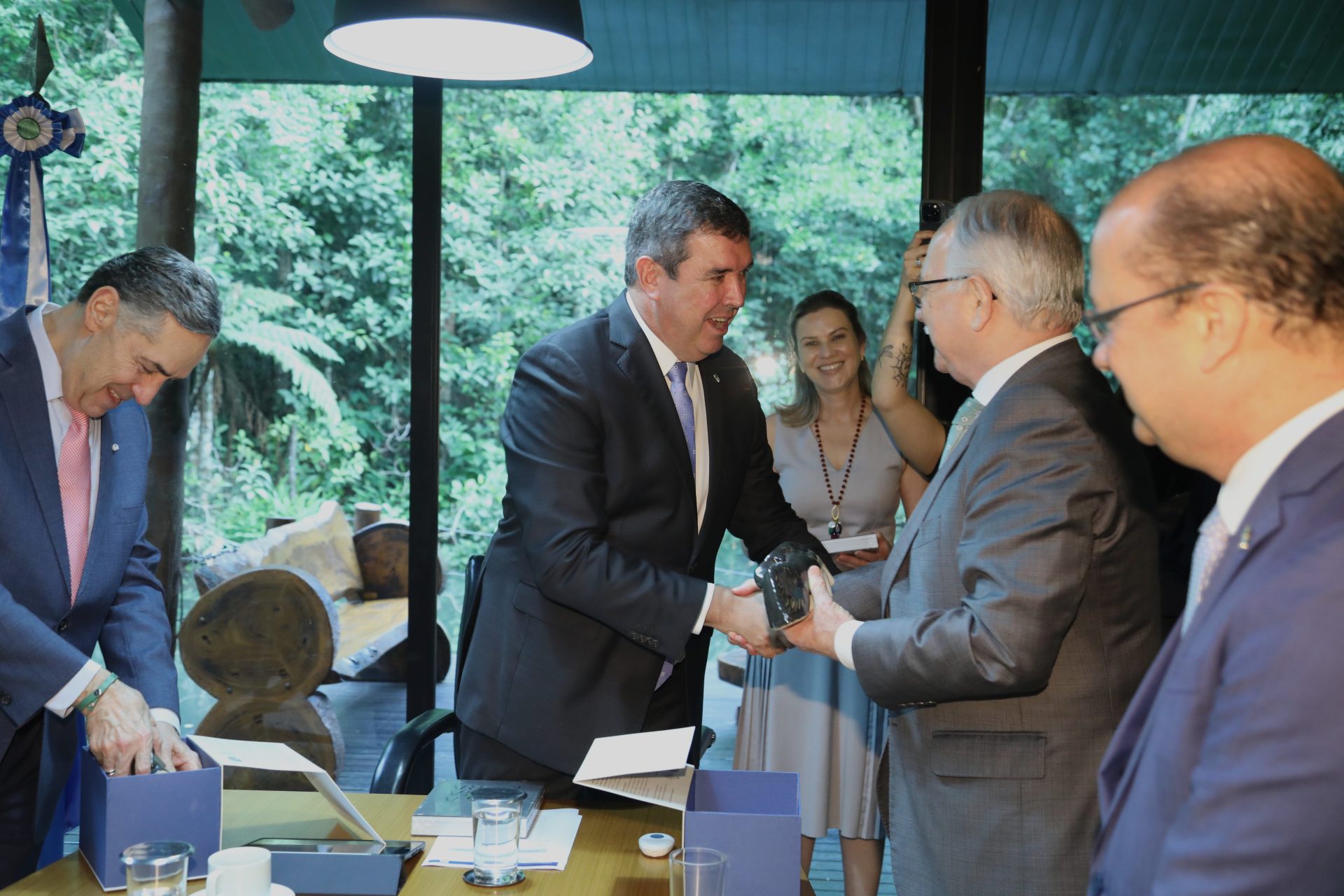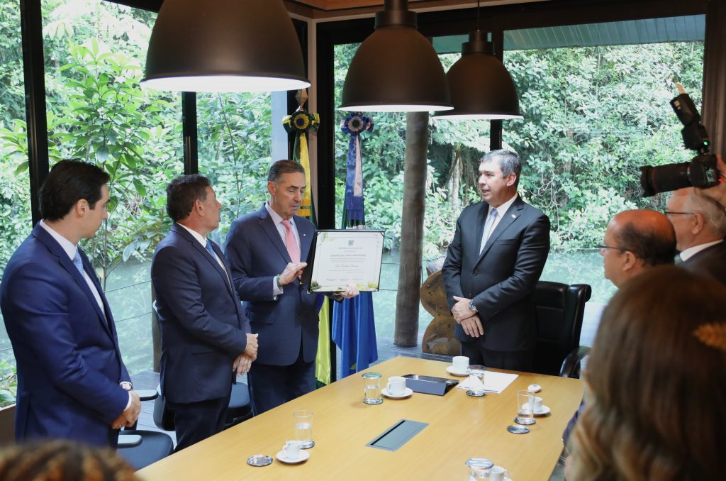 O governador Eduardo Riedel recebeu nesta segunda-feira (2) os ministros do STF (Supremo Tribunal Federal), Luís Roberto Barroso (presidente) e Edson Fachin (vice-presidente), no Gabinete do Receptivo.