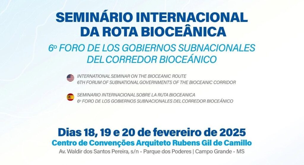 Entre os dias 18 e 20 de fevereiro de 2025, Campo Grande será palco do Seminário Internacional da Rota Bioceânica e do 6º Foro de los Gobiernos Subnacionales del Corredor Bioceânico.