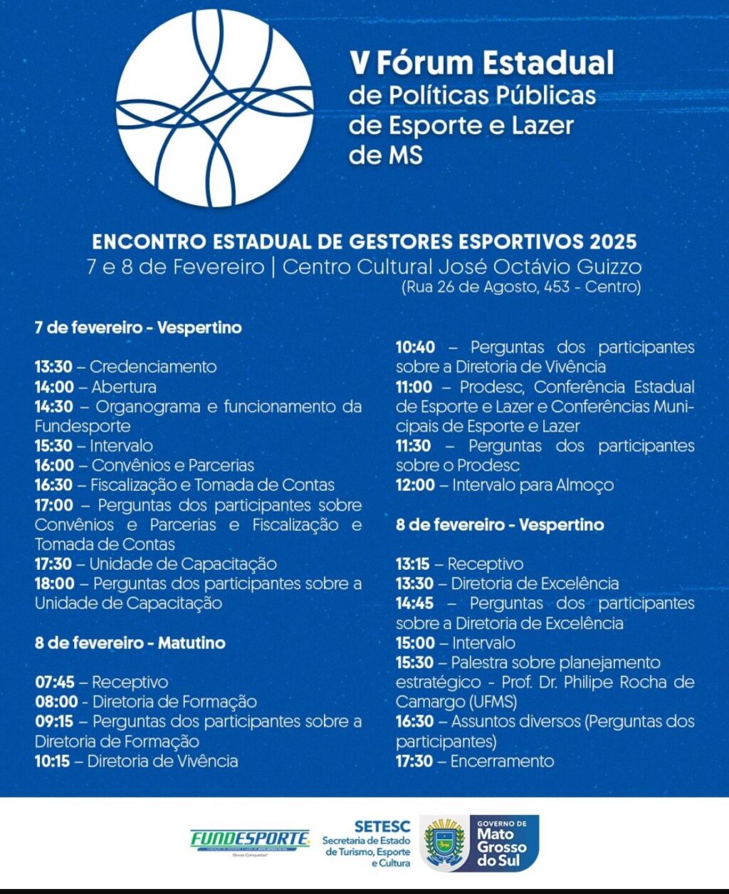 Com o propósito de apresentar os planos da Fundesporte (Fundação de Desporto e Lazer de Mato Grosso do Sul) para 2025, será realizado, nos dias 7 e 8 de fevereiro, o V Fórum Estadual de Políticas Públicas de Esporte e Lazer – Encontro Estadual de Gestores Esportivos 2025.