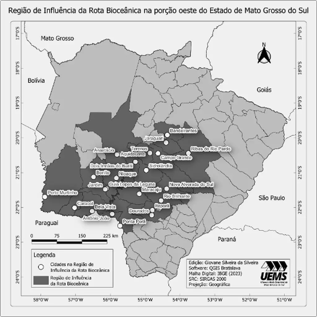 O recorte espacial dos 23 municípios que compõem a área de influência da Rota Bioceânica no oeste de Mato Grosso do Sul incluem Antônio João, Aquidauana, Anastácio, Bandeirantes, Bela Vista, Bonito, Campo Grande, Caracol, Dois Irmãos do Buriti, Dourados, Guia Lopes da Laguna, Itaporã, Jaraguari, Jardim, Maracaju, Nioaque, Nova Alvorada, Ponta Porã, Porto Murtinho, Ribas do Rio Pardo, Rio Brilhante, Sidrolândia e Terenos.