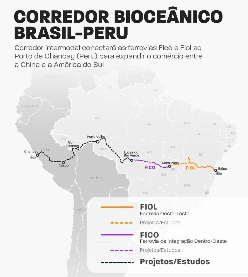 “A ideia é implantar um corredor ferroviário estruturante para transporte de carga no Brasil – de leste a oeste, passando por Bahia, Goiás, Mato Grosso, Rondônia e Acre. Toda a carga produzida na área central do país seria escoada por essa infraestrutura ferroviária, até chegar ao Porto de Chancay”, afirmou o secretário Nacional de Transporte Ferroviário, Leonardo Ribeiro.