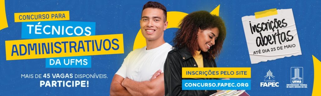 Estão abertas as inscrições para o concurso público para a carreira de técnico-administrativo em educação na UFMS. Ao todo, são 48 vagas para a Cidade Universitária e os Câmpus da UFMS de Aquidauana, Chapadão do Sul, Coxim, Naviraí, Nova Andradina, Paranaíba, Ponta Porã, Três Lagoas e do Pantanal. As inscrições podem ser feitas até 25 de maio por meio da página da Fundação de Apoio à Pesquisa, ao Ensino e à Cultura (Fapec).