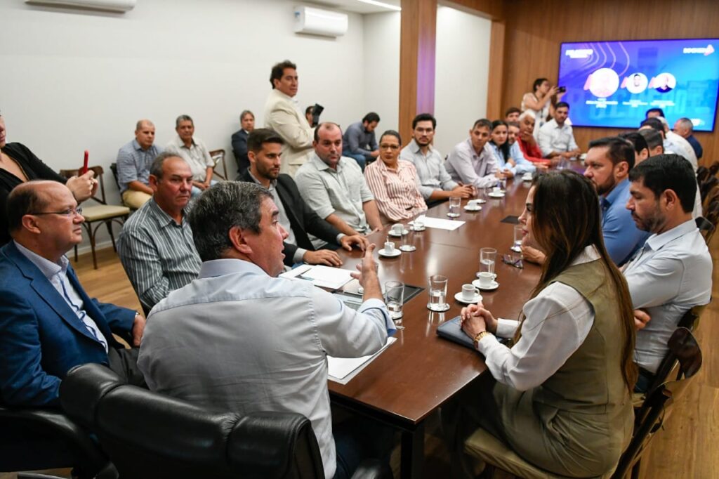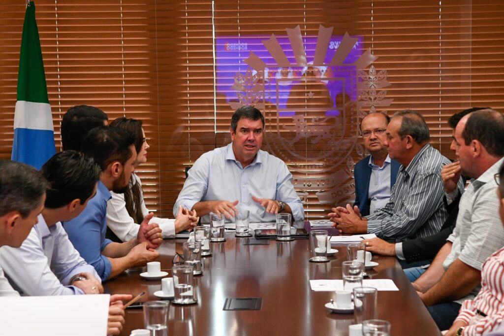 O governador Eduardo Riedel recebeu a comitiva do município de Rochedo nesta quinta-feira (15). Eles apresentaram demandas importantes para cidade, como a pavimentação de bairros e vias públicas, além do apoio para construção de uma nova ponte de concreto.