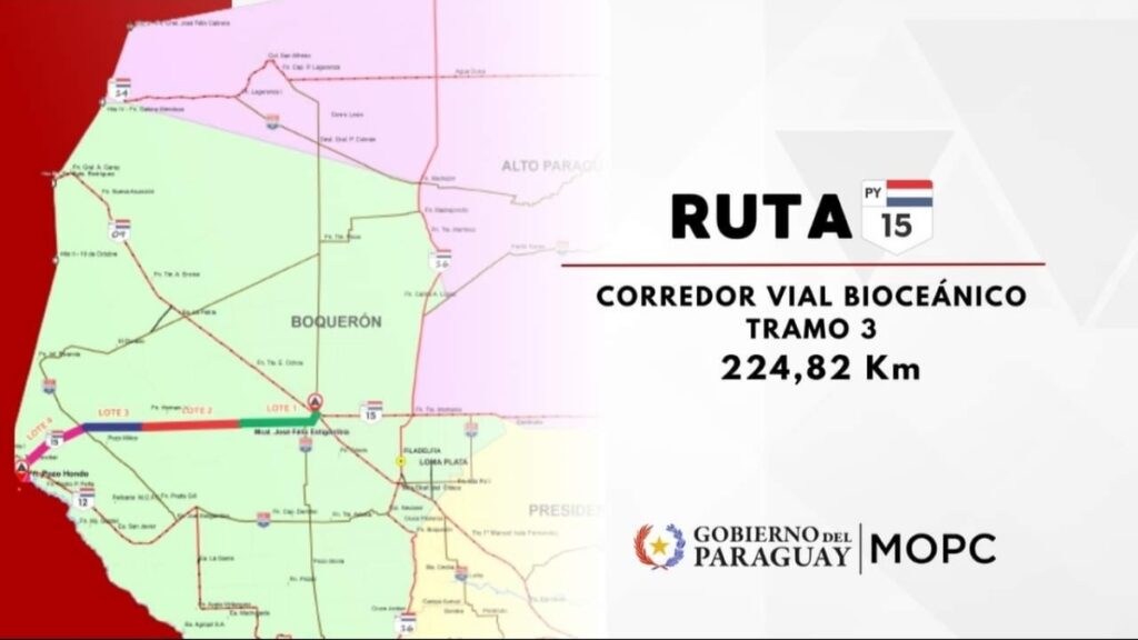 A Rota Bioceânica, cujo eixo principal é a Rota PY15, visa conectar os portos do Atlântico e do Pacífico através do Paraguai, Brasil, Argentina e Chile.
