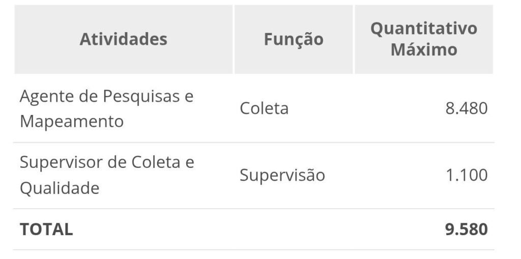 Do total de vagas, 8.480 serão para a função de Agente de Pesquisas e Mapeamento, responsável pela coleta de informações, e 1.100 para Supervisor de Coleta e Qualidade, que atua no acompanhamento e supervisão do trabalho de campo.