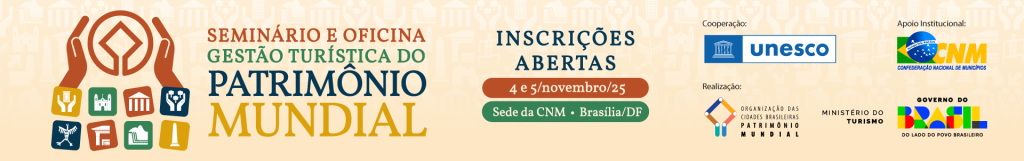 Discutir desafios e identificar oportunidades de aprimoramento da conservação, da valorização cultural e do desenvolvimento sustentável de patrimônios mundiais no Brasil. Este é objetivo do Seminário e Oficina Gestão Turística do Patrimônio Mundial, que será promovido nos dias 04 e 05 de novembro, em Brasília (DF), pelo Ministério do Turismo e a Organização das Cidades Brasileiras Patrimônio Mundial (OCBPM). (Faça AQUI sua inscrição)