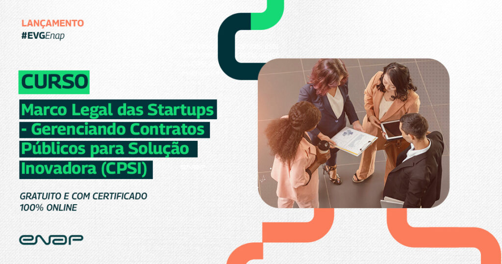 A Escola Nacional de Administração Pública (Enap) disponibilizou o curso “Marco Legal das Startups – Gerenciando Contratos Públicos para Solução Inovadora (CPSI)”, na plataforma Escola Virtual de Governo (EV.G). O curso é gratuito e 100% on-line.
