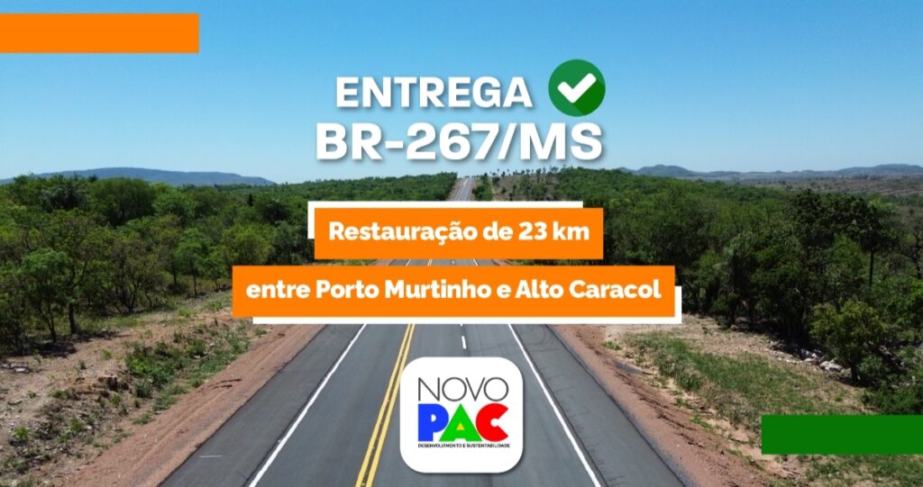 As equipes do Departamento Nacional de Infraestrutura de Transportes (DNIT) concluíram mais 23 dos 101,1 quilômetros que estão sendo restaurados na BR-267/MS, entre Porto Murtinho e Alto Caracol. O segmento, que vai do km 577 ao km 678,1, está contemplado no Novo PAC e conta com investimentos garantidos de R$ 254 milhões do Governo Federal.