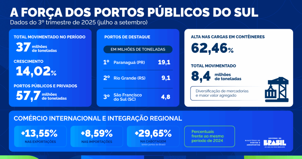 Os portos públicos da Região Sul (Paraná, Santa Catarina e Rio Grande do Sul) registraram um crescimento expressivo, de 14,02%, na movimentação de cargas no terceiro trimestre de 2025 (julho a setembro), em comparação ao mesmo período do ano anterior. Os dados, divulgados pela Agência Nacional de Transportes Aquaviários (Antaq), sinalizam uma forte recuperação da logística regional após os desafios climáticos enfrentados no ano passado.