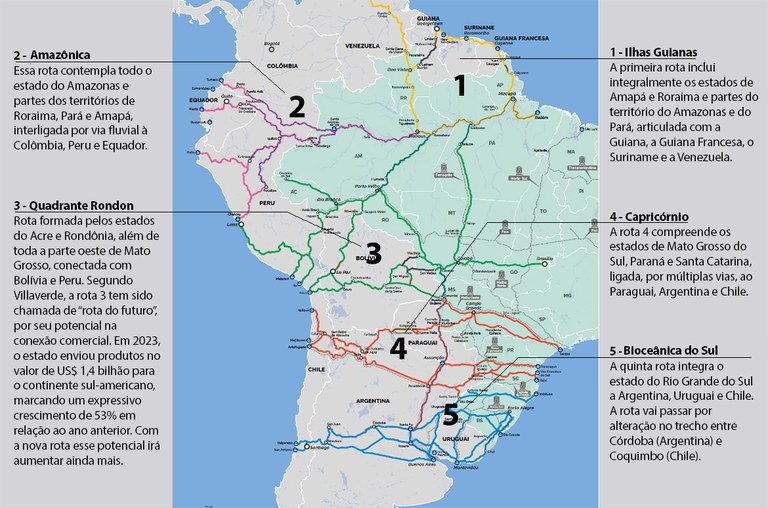 Essas rotas vão integrar o Brasil aos países da América do Sul, sejam países vizinhos que fazem fronteira e também países que não são vizinhos diretamente com o Equador e Chile, principalmente com os estados fronteiriços e os estados não fronteiriços do Brasil. Esse programa é composto por cinco rotas de integração, das quais três rotas passam pelo território da Amazônia.