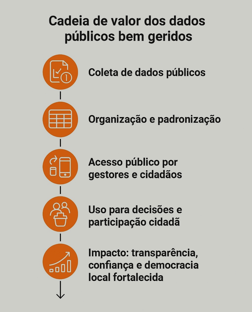 Quando os dados públicos são bem organizados, os gestores públicos têm clareza e os cidadãos têm acesso. Consequentemente, isso favorece prestação de contas, participação e engajamento. Em suma, a boa gestão dos dados públicos constrói alicerces para a democracia local funcionar de modo mais efetivo.