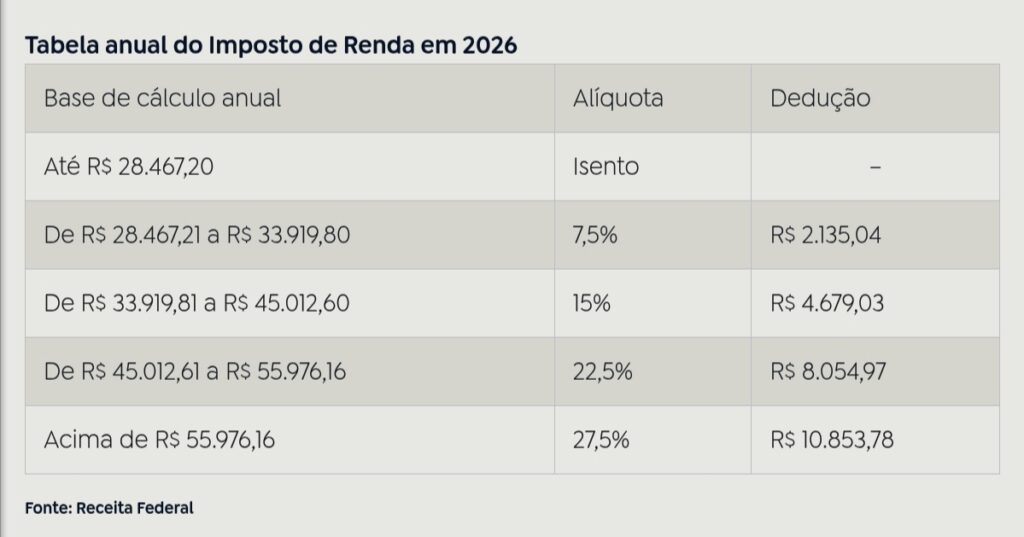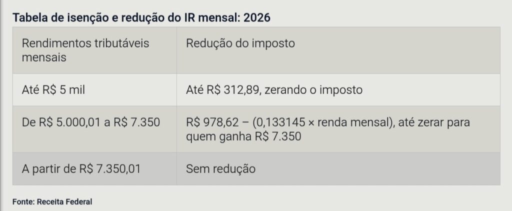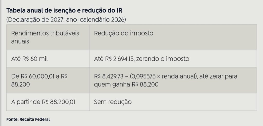 – isenção anual para quem ganhar até R$ 60 mil em 2026;