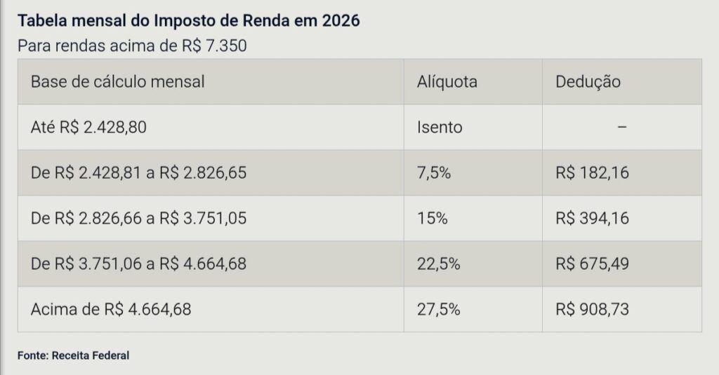As alterações valem para os salários pagos a partir de janeiro, com impacto percebido a partir do pagamento de fevereiro. As mudanças vão se refletir na Declaração do Imposto de Renda Pessoa Física de 2027, que considera os rendimentos de 2026.