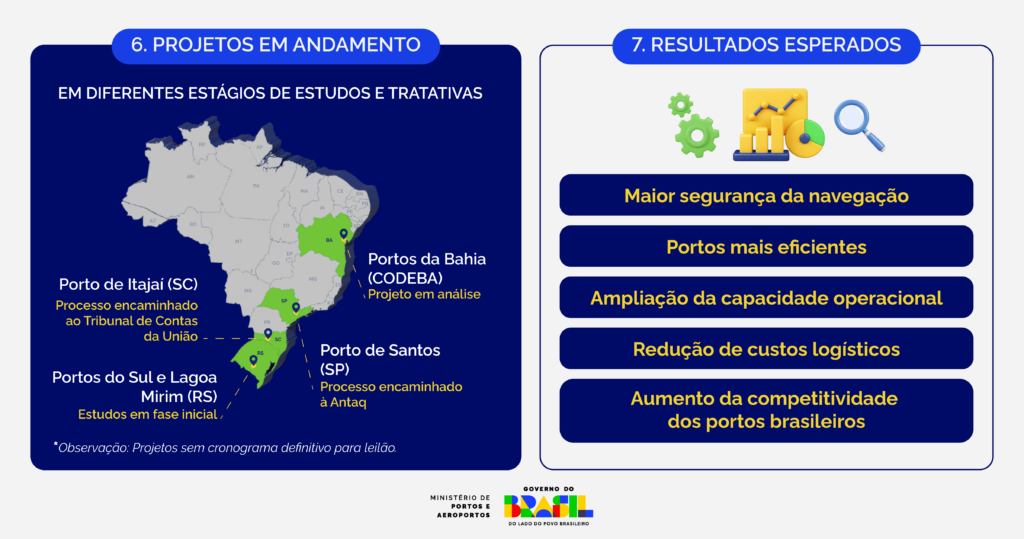 Outros projetos estratégicos, como os canais de acesso aos portos de Santos (SP), Rio Grande (RS) e aos portos sob gestão da Companhia das Docas do Estado da Bahia (Codeba), seguem em fase de estudos, análises técnicas e articulações institucionais, sem cronograma definitivo para leilão.