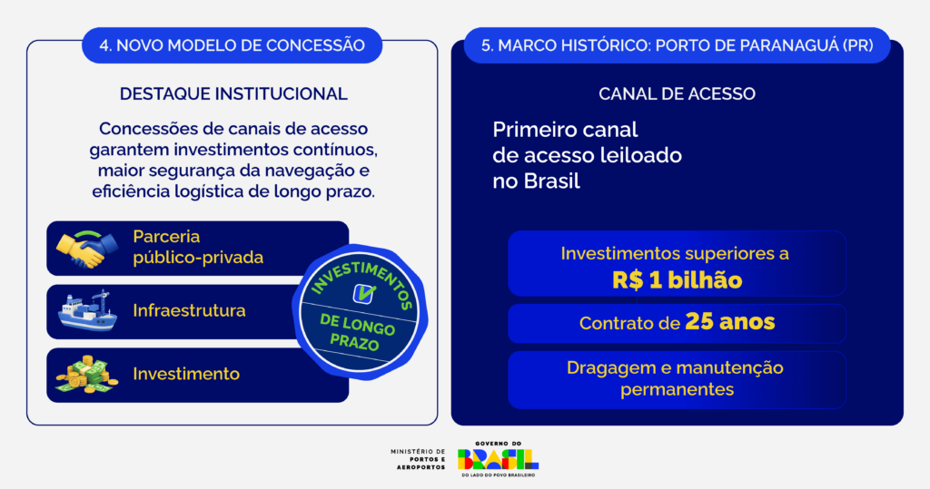 O primeiro marco dessa estratégia foi o leilão do canal de acesso ao Porto de Paranaguá, realizado em outubro de 2025, o primeiro do gênero no país. O contrato prevê investimentos superiores a R$ 1 bilhão ao longo de 25 anos, com possibilidade de prorrogação, e contempla a administração, manutenção e exploração da infraestrutura aquaviária, incluindo canais, bacias de evolução e áreas de fundeio.