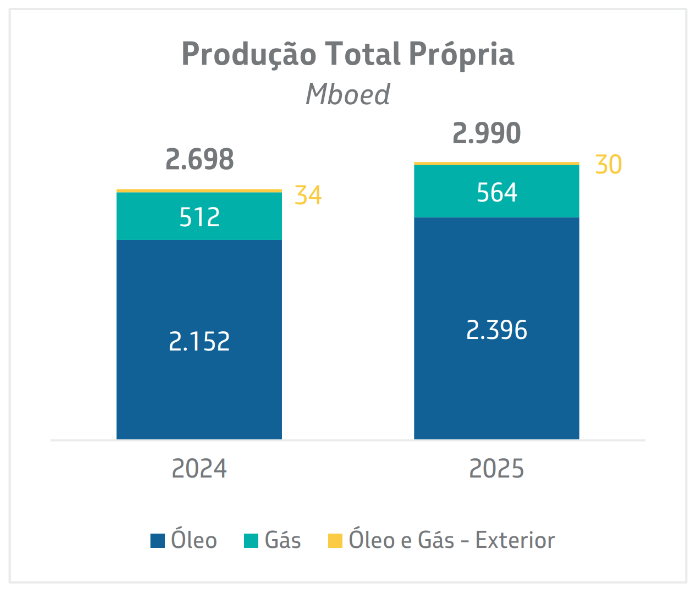 A produção total de óleo e gás natural da Petrobras superou em 2,8 pontos percentuais o limite superior da meta (+4%), alcançando 2,99 milhões de barris de óleo equivalente por dia (boed), representando um aumento de 11% em relação à produção de 2024.