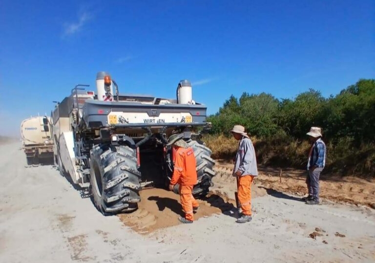 Apesar das condições climáticas adversas típicas da região do Chaco, os trabalhos estão progredindo de forma constante. Para dar suporte a esta fase, a logística de fornecimento de materiais foi reforçada, com mais caminhões transportando pedra da pedreira para os diversos locais de trabalho. Isso facilita a colocação de solo estabilizado com cimento, solo estabilizado com cal e base estabilizada, componentes essenciais na construção da estrada.