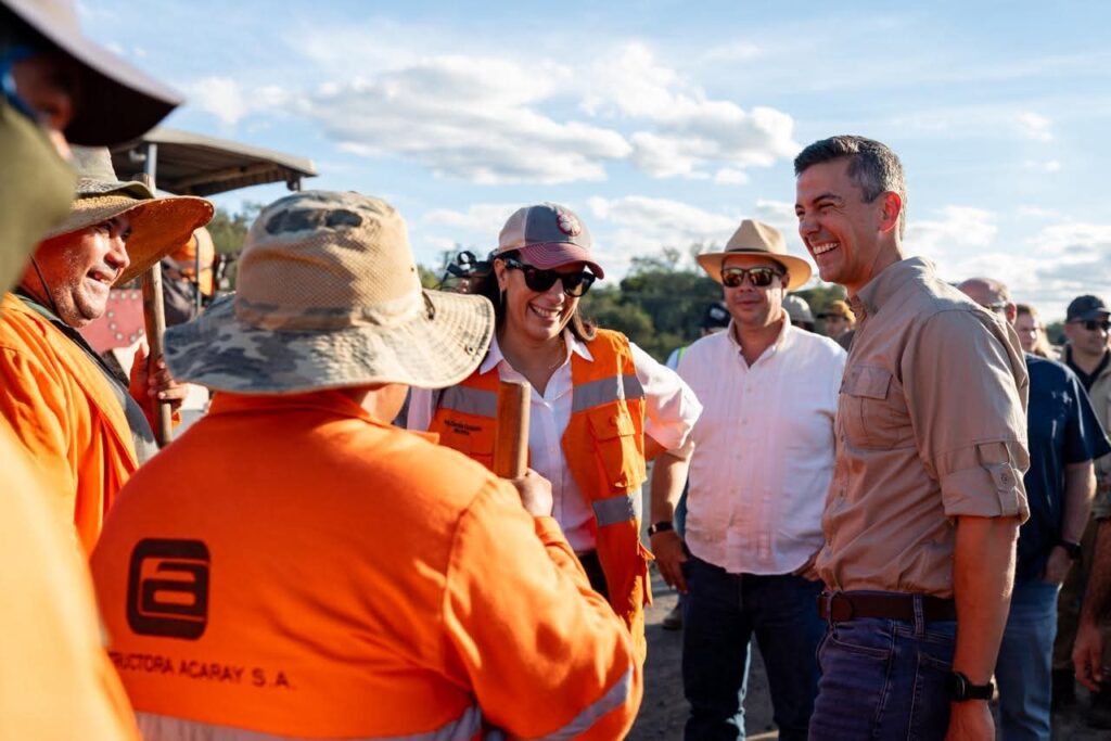 O presidente Santiago Peña, acompanhado da ministra Claudia Centurión e outras autoridades, supervisionou hoje a pavimentação da Rodovia PY15, destacando a importância histórica do projeto.
