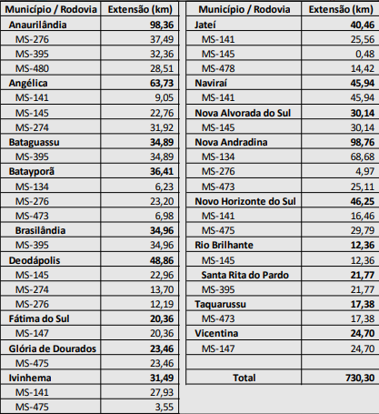 Nesse período, a empresa que ficar responsável pelo serviço terá que manter em boas condições de tráfego e segurança as rodovias MS-377 (entre Água Clara e Inocência) e MS-240 (entre Inocência e Paranaíba). São 208,7 km, todos rodoviárias, sendo 128,14 km na MS-377 (entre a BR-158 e a MS-112) e outros 80,56 km na MS-240 (entre a BR-262 e a MS-112).
