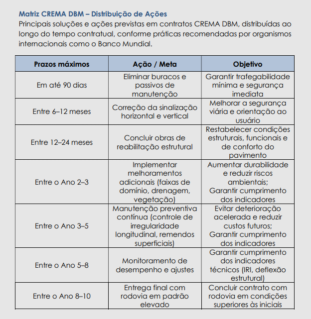 No DBM, a duração do contrato será de 10 anos, com contratação integrada de projeto, obra, manutenção e pagamento pelo Estado sendo feito com base no cumprimento de indicadores de desempenho previamente estabecidos em contrato – ou seja, os repasses não estão vinculados apenas à execução de serviços, mas também à qualidade das obras