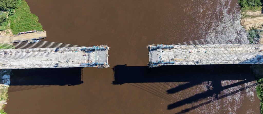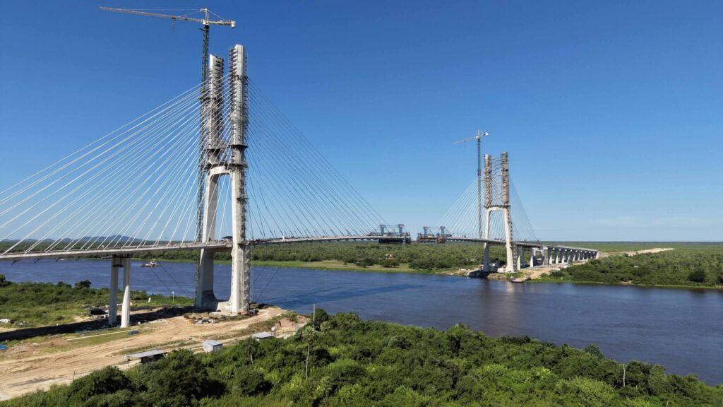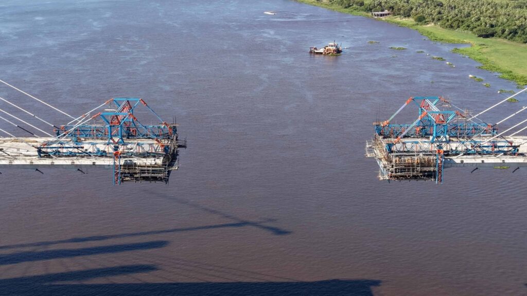 Nesta quinta-feira santa (02), reportagem por terra e pelo ar registrou que restam apenas 46 metros para fechar o vão central da ponte internacional (Ponte Bioceânica) sobre o Rio Paraguai — estrutura fundamental da passarela que integrará os dois países.